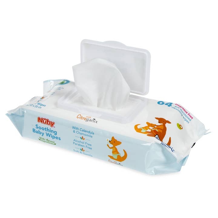 Nuby Soothing Baby Wipes with Citroganix are extra-soft, alcohol-free, and fragrance-free, made with Chamomile, Aloe & Calendula for gentle, soothing care. Includes 8 packs (512 wipes total).